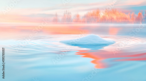 Calm water reflects pastel colors at sunrise over a serene landscape