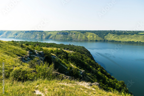 Calm waters and a green hill define the scenic beauty of Bakota Bay on the Dniester River, Ukraine.