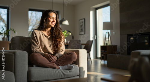 Calm woman meditates cross-legged on living room couch, embracing mindfulness and tranquility