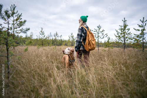 Calm woman owner strolling with Vizsla dog through marshy area in autumn peat bog surrounded by dry tall grasses. Female with dog stroll on wetland in North, enjoy silence of swamp nature.