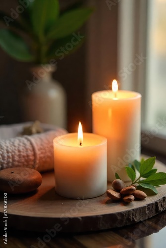 Calming Spa Atmosphere Burning Candles, Essential Oils, and Natural Scents Create a Relaxing Ambiance Perfect for Wellness, Self-Care, and Meditation