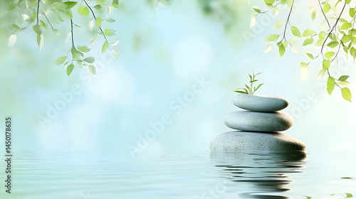 Calming spa scene with balanced stones, rippling water, and ethereal foliage