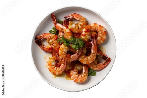 Camarones Al Ajillo On A White Plate. On An Isolated Transparent Background, Png. Mexican Cuisine. Generative AI