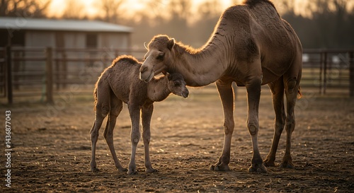 Camel and Baby Camel Standing Together in a Dusty Outdoor Enclosure