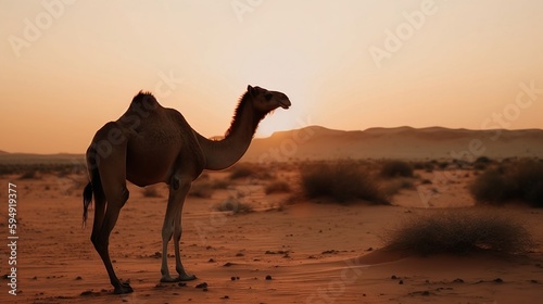 Camel at the desert during golden hour. Natural geographic. Created using generative AI.