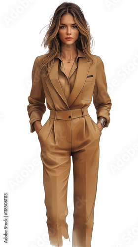 Camel Power Suit: A sophisticated woman exudes confidence in a stylish camel-colored pantsuit. The image is perfect for fashion, business, and empowerment themes.