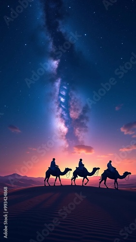 Camel riders journeying through the desert under the Milky Way
