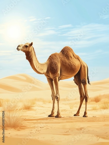 Camel Standing in Desert Landscape with Blue Sky and Sunny Weather