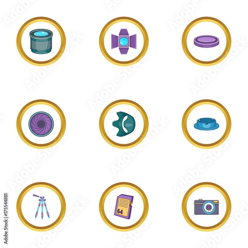 Camera accessories icons set, cartoon style