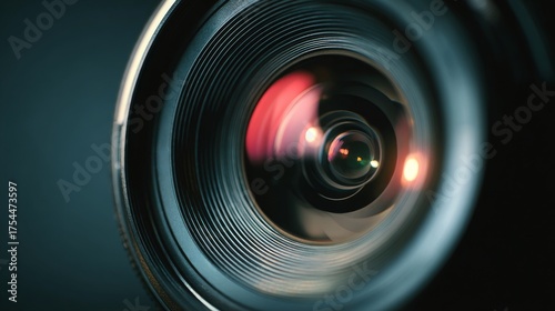 Camera lens close-up, macro photography, detailed glass elements and reflections