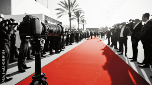 camera on tripod captures red carpet event surrounded by photographers and attendees. scene is lively and filled with anticipation