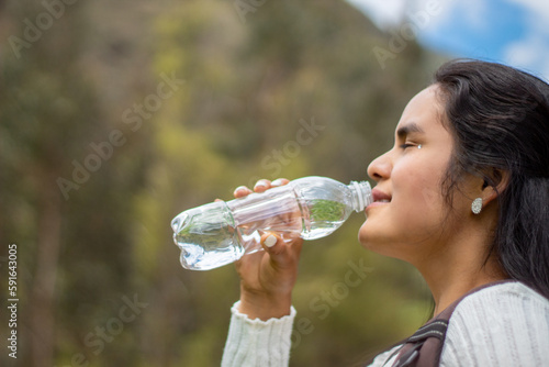 Caminante con una mochila bebiendo agua contra un cielo azul nublado,cielo azul,paisaje,explorar,cocepto turismo,