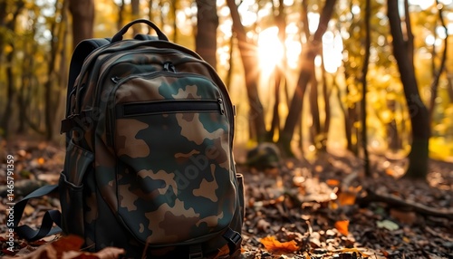 Camouflage backpack in woodland setting with sunlight filtering through trees