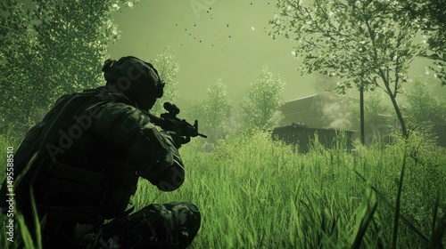 Camouflaged soldier in the tall grass, facing a conflict zone in a dense forest