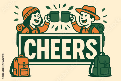 Camp mug cheers banner flat vector illustration bold oversized text inside rectangular frame cartoon characters raising mugs over the banner like toast backpacks at their feet pine green.