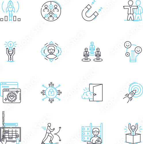 Campaign release linear icons set. Launch, Arrival, Introduction, Unveiling, Debut, Premiere, Announcement line vector and concept signs. Rollout,Initiation,Inauguration outline illustrations