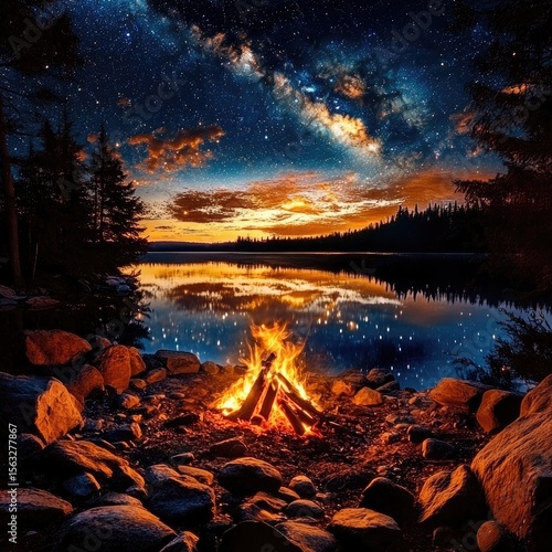 Campfire By Lake at Night With Starry Sky, Pine Trees and Rocks Landscape View