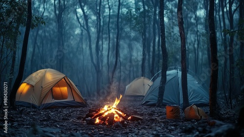 Campfire in a Misty Forest