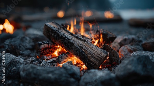 Campfire with burning logs surrounded by rocks