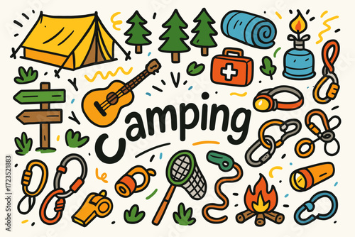 Camping adventure icon set: outdoor, equipment, activities collection, flat style
