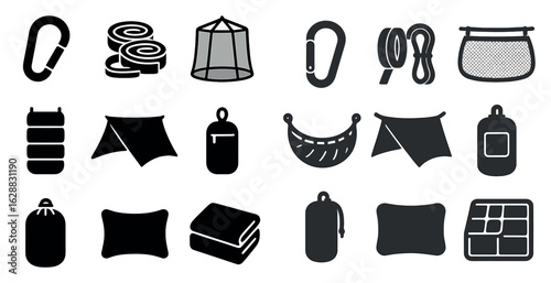 Camping and outdoors solid icons set – filled, gear, nature exploration symbols