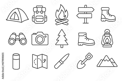 Camping gear outline icon set. Outdoor adventure and hiking equipment collection. Vector line art symbols for travel, tourism, and exploration. Forest and mountain elements.