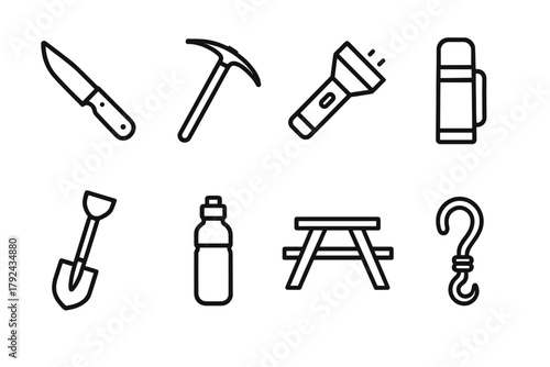 Camping icon set in linear style on dark background for outdoor and adventure design
