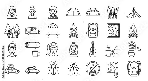 Camping icons outline set with people and equipment. Recreation, travel, nature, adventure, outdoor activities, summer.