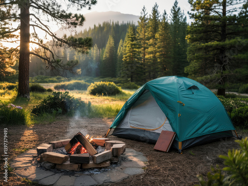 Camping in a serene forest with a cozy tent and a crackling campfire during golden hour