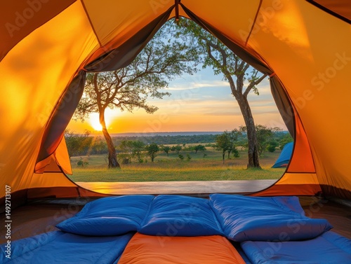 Camping tent interior view at sunrise in savanna; looking out from tent at landscape, trees, and sky; adventure travel lifestyle