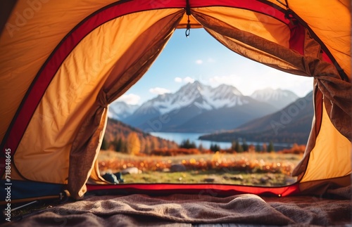 Camping tent scenic view of the mountains in the autumn