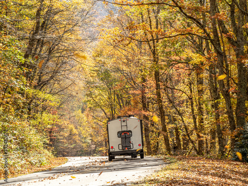Camping trailer driving down Blue Ridge Parkway with a canopy of colorful fall foliage.