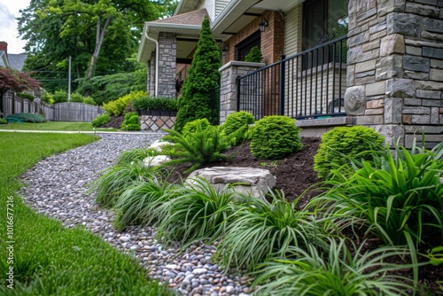 Canadian Suburban Home with Lush Front Yard, Iron Fence, and Natural Pebble Pathway