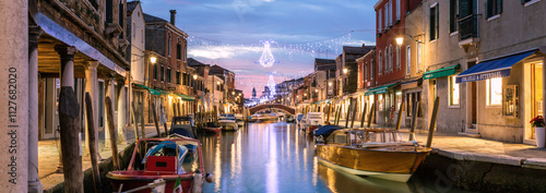 Canal at sunset with Christmas lights, Murano island, Venice, Italy