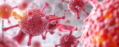Cancer cells concept. Close-up of virus particles illustrating cellular structures and infection process.