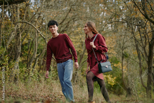 Candid portrait of a young couple walking through autumn woods, natural expressions and relaxed posture convey authentic, honest connection amid soft golden foliage.