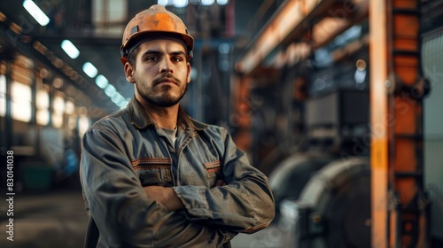 Candid shot of a confident Hispanic male factory worker with arms crossed, industrial construction industry, generative AI