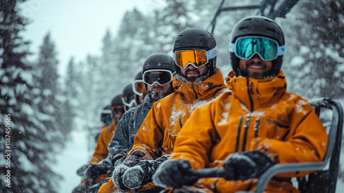 Candid shot of a group of non-white skiers and snowboarders riding a lift at a ski resort in Winter Park, Colorado, taken by a photographer sitting beside them on the chair.
