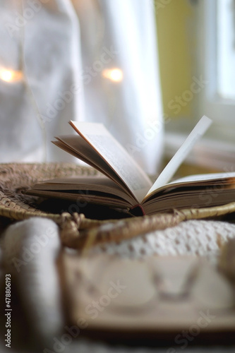 Candle holder with lit candle, open book and reading glasses, soft knitted blanket and wicker basket. Hygge at home. Selective focus.