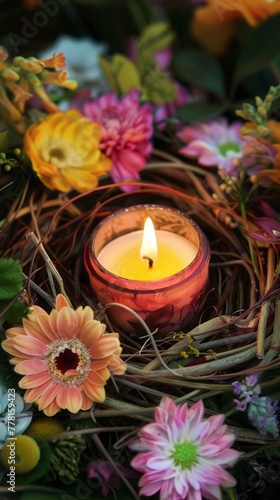 candle in a nest with flowers.