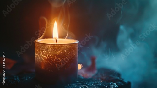 Candle with wax burning against dark backdrop