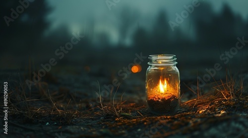 Candlelight in the forest. A single candle glows in a glass jar, illuminating the forest floor.