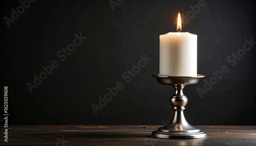 Candlelight Serenity: A lit white pillar candle in a silver holder glows softly against a dark background, creating a peaceful atmosphere.
