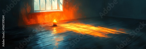 Candlelight Serenity, an illustration capturing a solitary candle casting warm light and flickering shadows in a tranquil, empty room