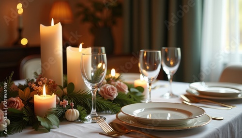Candlelit Christmas Dinner Table Setting with Festive Accents