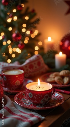 Candles and a plate with a candle on a table with a christmas tree in the background