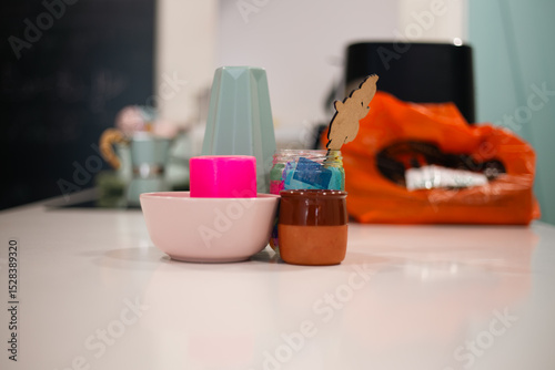 Candles and pots in harmonic colours in an interior decor home room