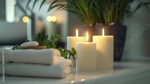 Candles and various spa products taken close-up, Flower pots and spa stones, cozy and emotional atmosphere