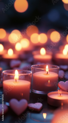 Candles illuminate a romantic setting with heart-shaped decorations during a serene evening