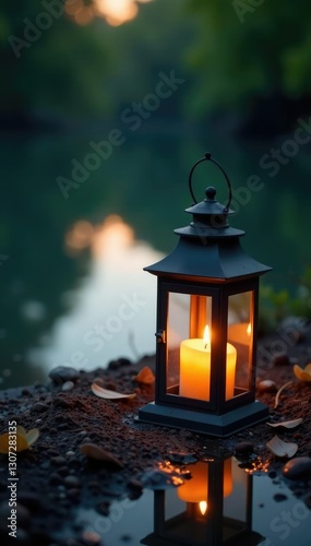 Candles in a lantern placed on the ground near a lake or pool, mourning, reflections